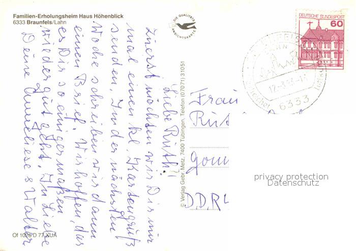 72672984 alte Postkarte Braunfels Haus Hoehenblick postalisch gelaufen Erhaltung siehe scans [AndreD76] KatCode: 11110006532003