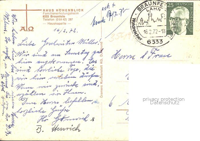 71975657 alte Postkarte Braunfels Haus Hoehenblick Hauskapelle postalisch gelaufen Erhaltung siehe scans KatCode: 11110006532003