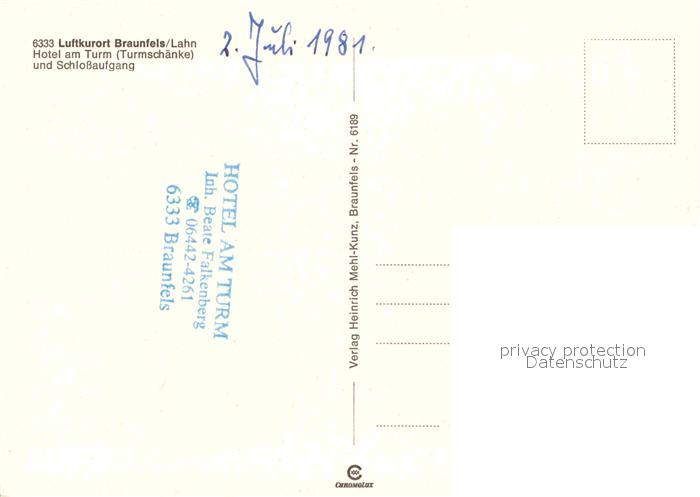 72719272 Braunfels Hotel am Turm Turmschaenke Schloss Luftkurort postalisch nicht gelaufen Erhaltung siehe scans [FriedD77] KatCode: 11110006532003