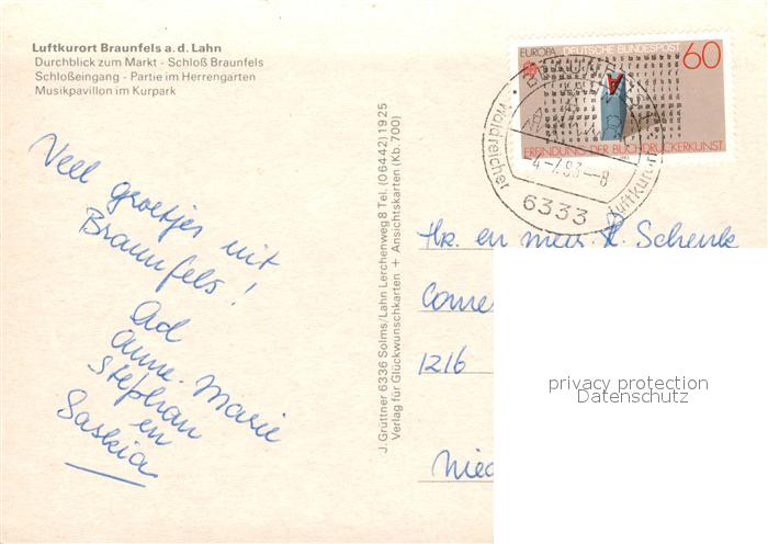 72928650 alte Postkarte Braunfels Mark Schloss Braunfels Schlosseingang Herrengarten Musikpavillon Kurpark postalisch gelaufen Erhaltung siehe scans [WerneD78] KatCode: 11110006532003