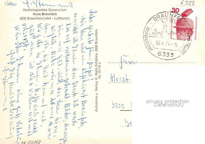 72901993 alte Postkarte Braunfels Neurol Sanatorium Haus Braunfels postalisch gelaufen Erhaltung siehe scans [WerneD78] KatCode: 11110006532003
