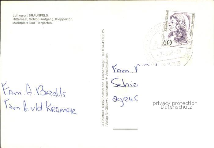 72310233 alte Postkarte Braunfels Rittersaal Schloss-Aufgang Kleppertor Marktplatz postalisch gelaufen Erhaltung siehe scans KatCode: 11110006532003
