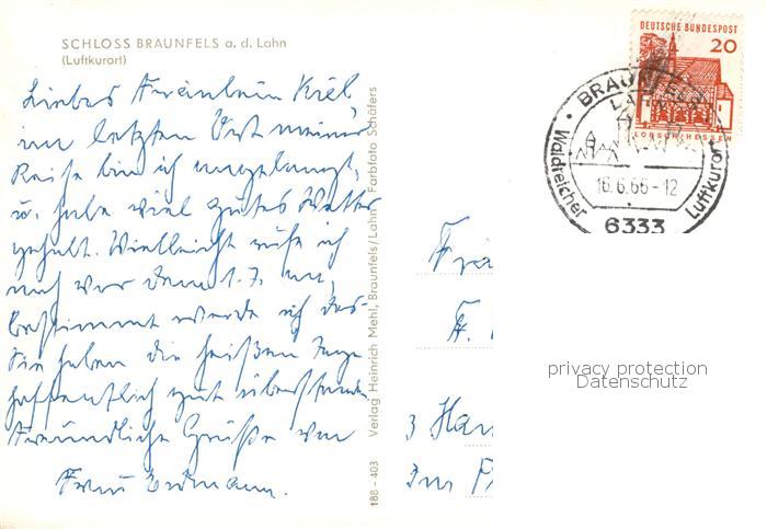 73810399 alte Postkarte Braunfels Schloss Braunfels postalisch gelaufen Erhaltung siehe scans [FriedD77] KatCode: 11110006532003