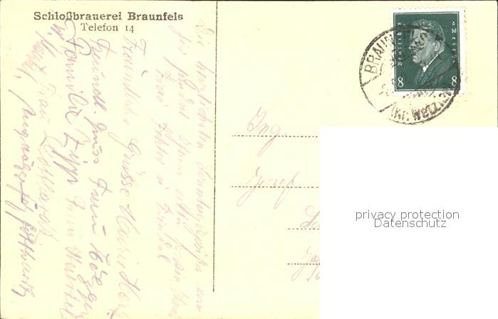 72096035 alte Postkarte Braunfels Schloss Schlossbrauerei postalisch gelaufen Erhaltung siehe scans KatCode: 11110006532003
