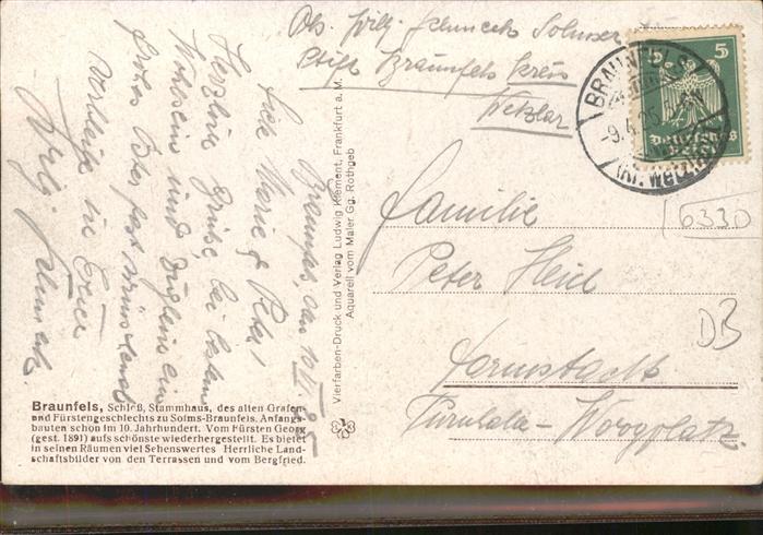 41543292 alte Postkarte Braunfels Schloss Wappen Kuenstlerkarte postalisch gelaufen Erhaltung siehe scans KatCode: 11110006532003