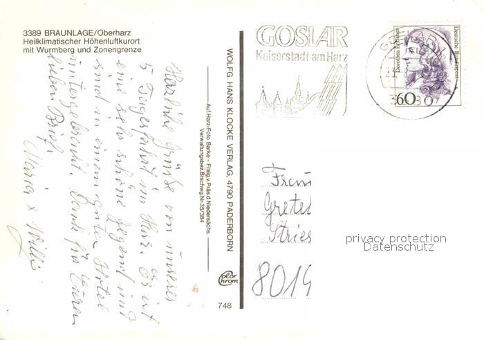 72793007 alte Postkarte Braunlage Harz postalisch gelaufen Erhaltung siehe scans [NatalD47] KatCode: 11110003153003
