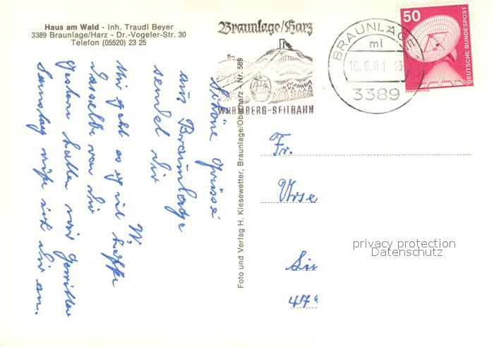 73661775 Braunlage Harz Gaestehaus Pension Haus am Wald postalisch gelaufen Erhaltung siehe scans [FriedD77] alte Postkarte Frie Katcode 11110003153003