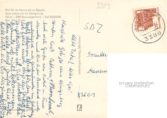 73744911 Braunlage Harz Gasthaus Koenigskrug postalisch gelaufen Erhaltung siehe scans [FriedD77] alte Postkarte Frie Katcode 11110003153003