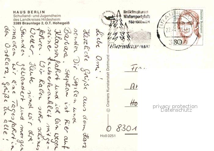 72843967 alte Postkarte Braunlage Harz Haus Berlin Turnhalle Hallenbad Aussenansicht postalisch gelaufen Erhaltung siehe scans [AndreD76] KatCode: 11110003153003