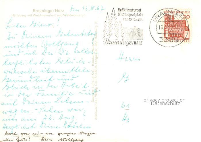 73734496 Braunlage Harz Huetteberg mit Weidmannsheil und Weidmannsruh postalisch gelaufen Fliegeraufnahme Erhaltung siehe scans [FriedD77] Fliegeraufnahme alte Postkarte Frie Katcode 11110003153003