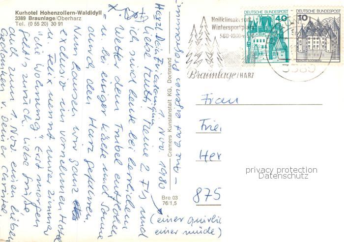 73766079 Braunlage Harz Kurhotel Hohenzollern Waldidyll postalisch gelaufen Erhaltung siehe scans [FriedD77] alte Postkarte Frie Katcode 11110003153003