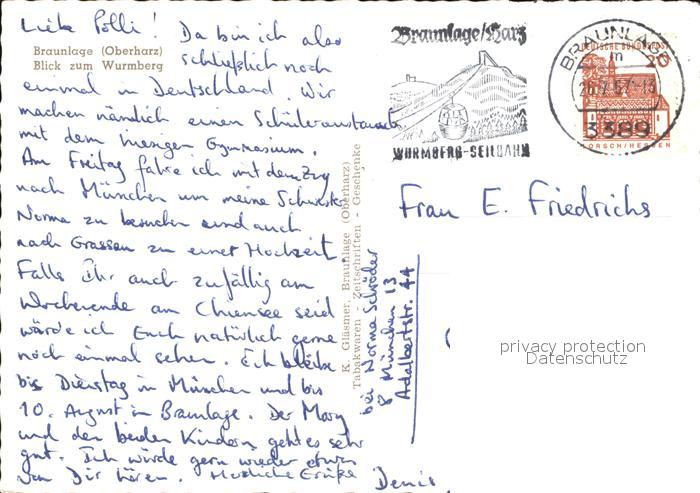 72447672 alte Postkarte Braunlage Harz mit Wurmberg postalisch gelaufen Erhaltung siehe scans KatCode: 11110003153003