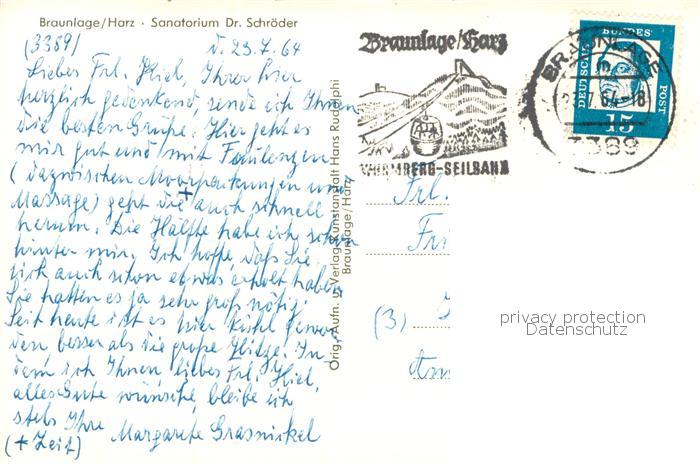 73811844 Braunlage Harz Sanatorium Dr Schroeder postalisch gelaufen Erhaltung siehe scans [WerneD78] alte Postkarte Wern Katcode 11110003153003