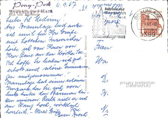 72521950 alte Postkarte Braunlage Harz Wurmberg postalisch gelaufen Erhaltung siehe scans KatCode: 11110003153003