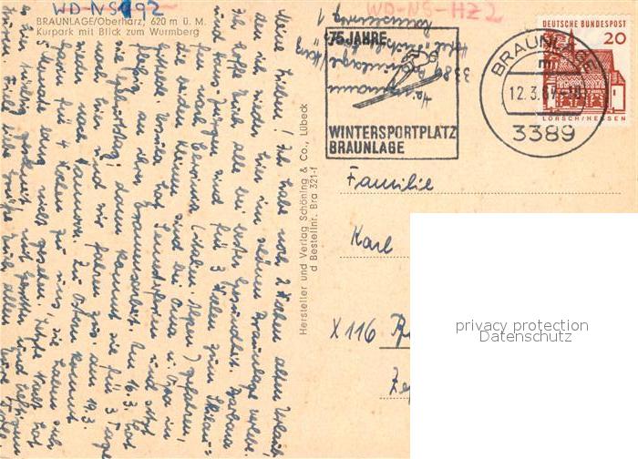 72930822 alte Postkarte Braunlage Kurpark mit Wurmberg postalisch gelaufen Erhaltung siehe scans [LiesaD40] KatCode: 11110003153003
