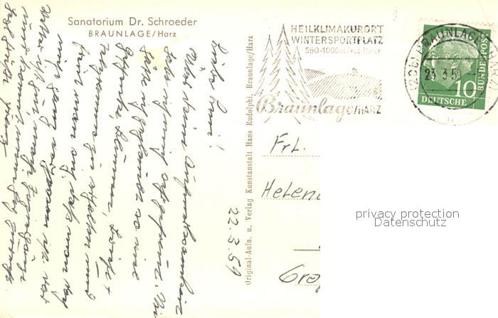 73282525 alte Postkarte Braunlage Sanatorium Dr. Schroeder postalisch gelaufen Erhaltung siehe scans [NatalD47] KatCode: 11110003153003