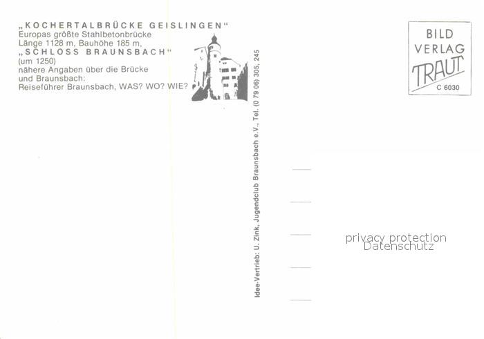 72767212 Braunsbach Wuerttemberg Kochertalbruecke Geislingen Schloss Braunsbach postalisch nicht gelaufen Erhaltung siehe scans [WerneD78] KatCode: 11110008127009