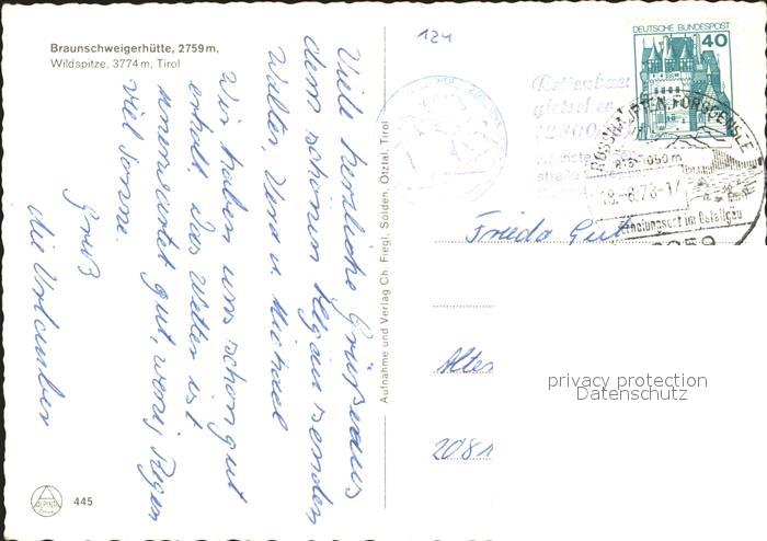 72288231 alte Postkarte Braunschweigerhuette Wildspitze postalisch gelaufen Erhaltung siehe scans KatCode: 11390334070203