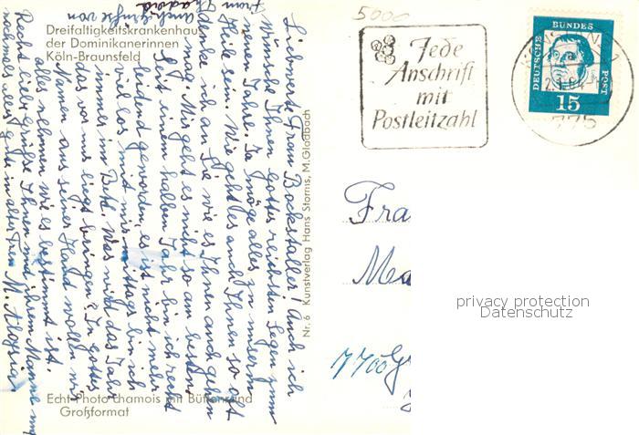73860372 alte Postkarte Braunsfeld Koeln Dreifaltigkeitskrankenhaus der Dominikanerinnen postalisch gelaufen Erhaltung siehe scans [FriedD77] KatCode: 11110005315000