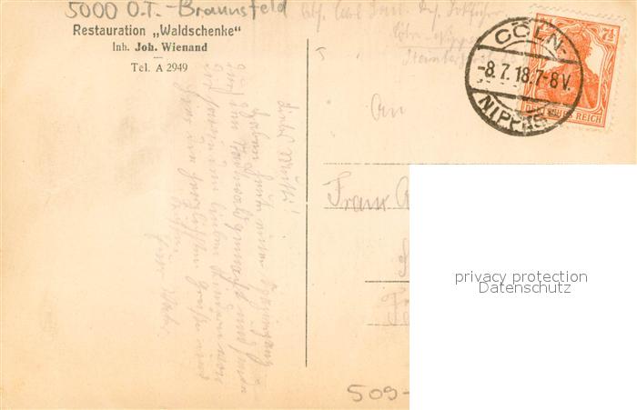 73748865 alte Postkarte Braunsfeld Vorderansicht Waldschenke Wildpark Rueckansicht postalisch gelaufen Erhaltung siehe scans [WerneD78] KatCode: 11110005315000