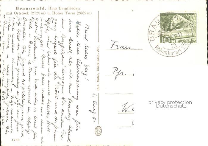 11631860 alte Postkarte Braunwald GL Haus Bergfrieden mit Ortstock und Hoher Turm Glarner Alpen postalisch gelaufen Erhaltung siehe scans KatCode: 11470090300864