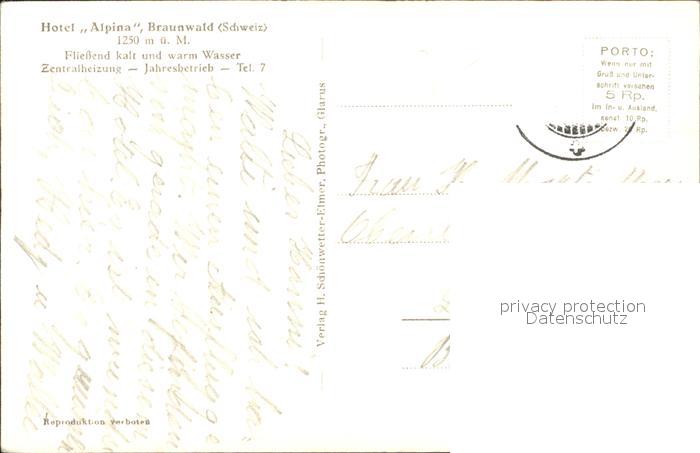 11653725 alte Postkarte Braunwald GL Hotel Alpina postalisch gelaufen Erhaltung siehe scans KatCode: 11470090300864