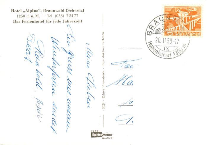13896617 alte Postkarte Braunwald GL Hotel Alpina Winterpanorama Alpen postalisch gelaufen Erhaltung siehe scans [FriedD77] KatCode: 11470090300864