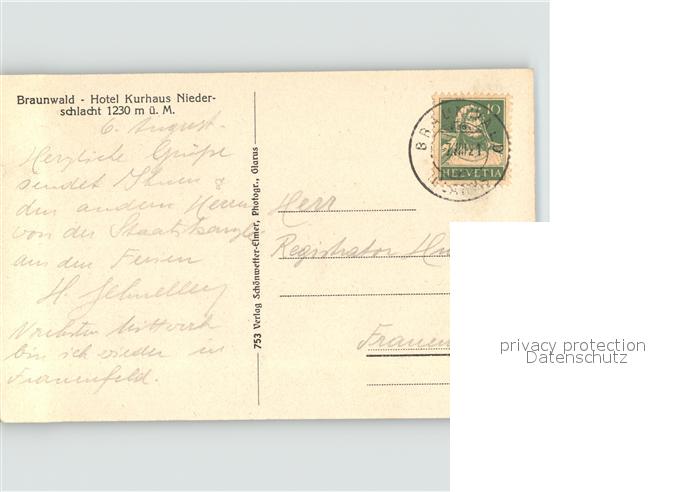 11834340 alte Postkarte Braunwald GL Hotel Kurhaus Niederschlacht postalisch gelaufen Erhaltung siehe scans KatCode: 11470090300864