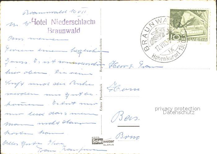 11631934 alte Postkarte Braunwald GL Hotel Niederschlacht mit Ortstock Glarner Alpen postalisch gelaufen Erhaltung siehe scans KatCode: 11470090300864
