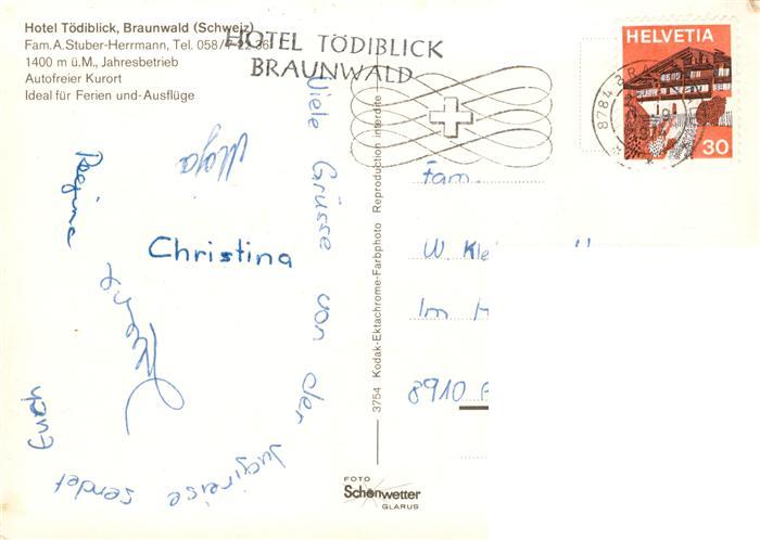 13875943 alte Postkarte Braunwald GL Hotel Toediblick postalisch gelaufen Erhaltung siehe scans [WerneD78] KatCode: 11470090300864