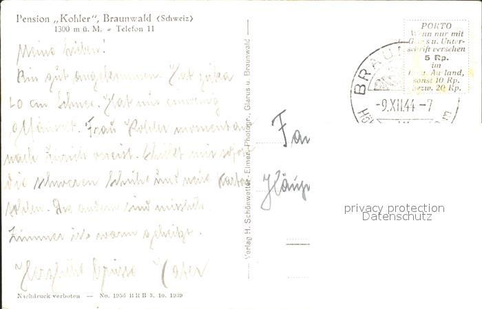 11653731 alte Postkarte Braunwald GL Pension Kohler mit Ortstock postalisch gelaufen KatCode: 11470090300864