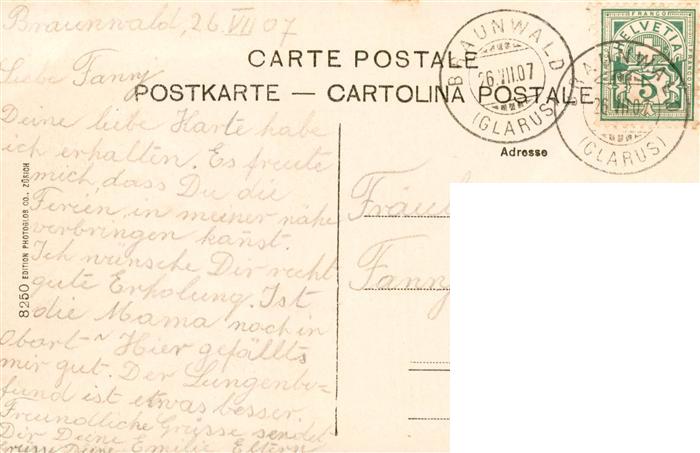 13908482 alte Postkarte Braunwald GL Sanatorium Braunwald mit Blick auf Linthal postalisch gelaufen Erhaltung siehe scans [FriedD77] KatCode: 11470090300864