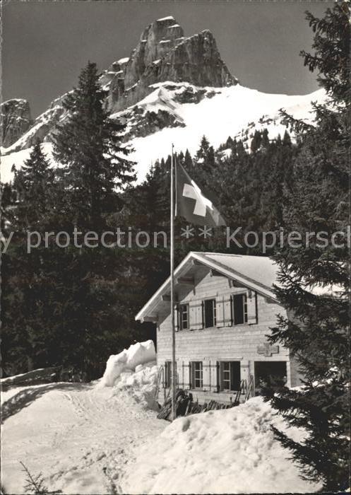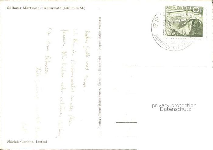 11631926 alte Postkarte Braunwald GL Skihaus Mattwald Schweizer Flagge Wintersportplatz postalisch gelaufen Erhaltung siehe scans KatCode: 11470090300864