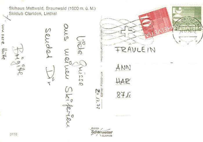 13921138 alte Postkarte Braunwald GL Skihaus Mattwald Skiclub Clariden Linthal postalisch gelaufen Erhaltung siehe scans [FriedD77] KatCode: 11470090300864