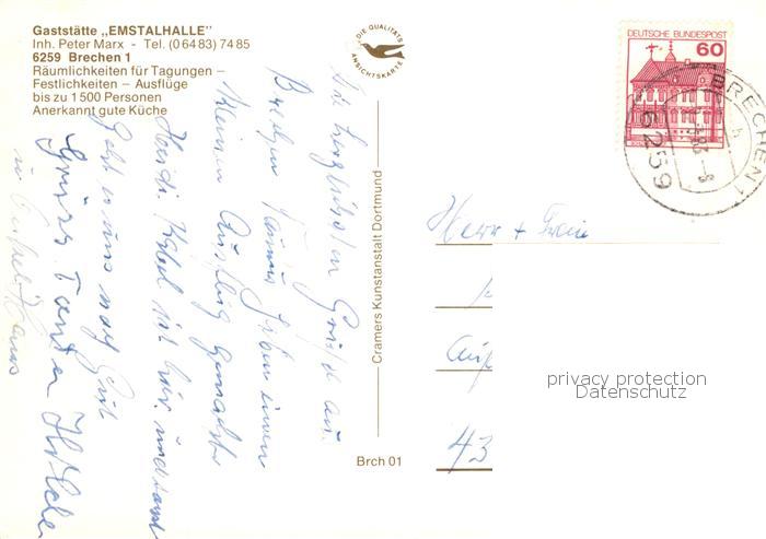 73815618 alte Postkarte Brechen Panorama Gaststaette Emstalhalle Gastraeume postalisch gelaufen Erhaltung siehe scans [FriedD77] KatCode: 11110006533002