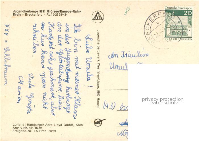 73685745 alte Postkarte Breckerfeld Jugendherberge Gloersee postalisch gelaufen Erhaltung siehe scans [WerneD78] KatCode: 11110005954004