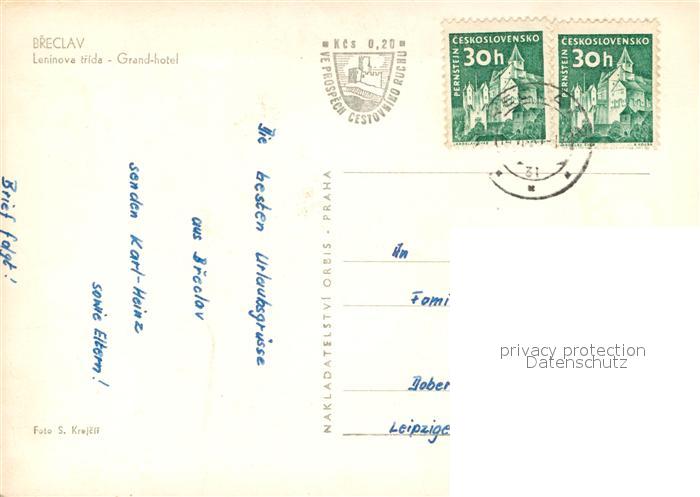 32983566 old postcard Breclav Lundenburg Leninova trida Grand-Hotel postalisch gelaufen Erhaltung siehe scans [NatalD47] KatCode: 11520