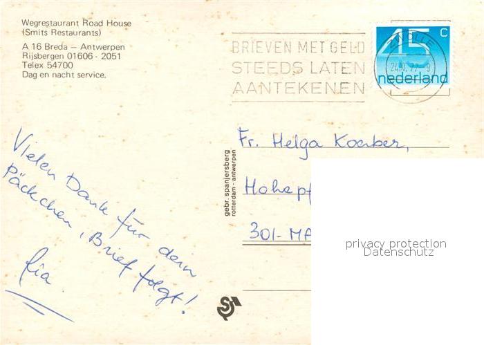 73338799 carte postale Breda Anvers Road House Rezeption Gastraum postalisch gelaufen Erhaltung siehe scans [WerneD78] KatCode: 11070011000017