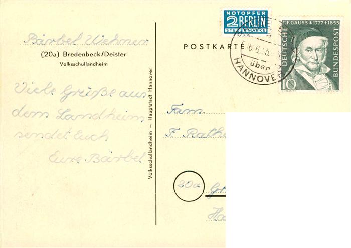 73887692 alte Postkarte Bredenbeck Deister Volksschullandheim postalisch gelaufen Erhaltung siehe scans [WerneD78] KatCode: 11110003241020