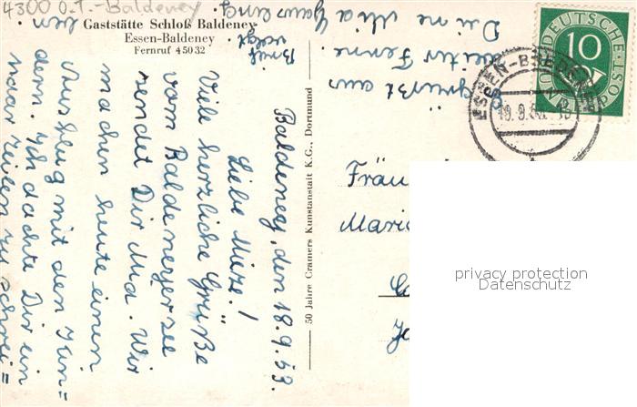 73692793 alte Postkarte Bredeney Seegaststaette Schloss Baldeney und Umgebung Baldeneysee Fahrgastschiff Villa Huegel postalisch gelaufen Erhaltung siehe scans [FriedD77] KatCode: 11110005113000