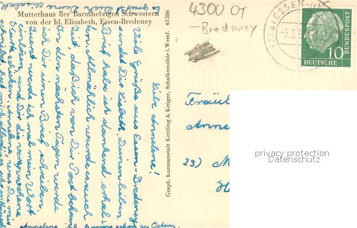 73692802 alte Postkarte Bredeney Seitenansicht der Kirche mit Binnenhof Mutterhaus der Barmherzigen Schwestern von der hl. Elisabeth postalisch gelaufen Erhaltung siehe scans [FriedD77] KatCode: 11110005113000