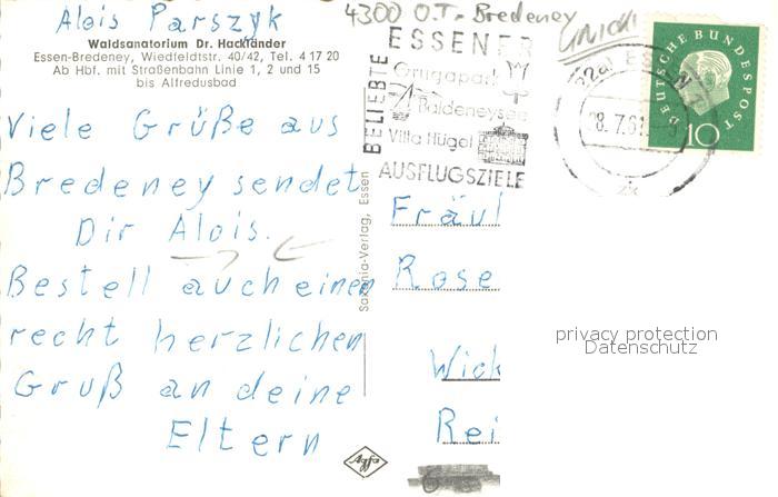73692809 alte Postkarte Bredeney Waldsanatorium Dr. Hacklaender postalisch gelaufen Erhaltung siehe scans [FriedD77] KatCode: 11110005113000