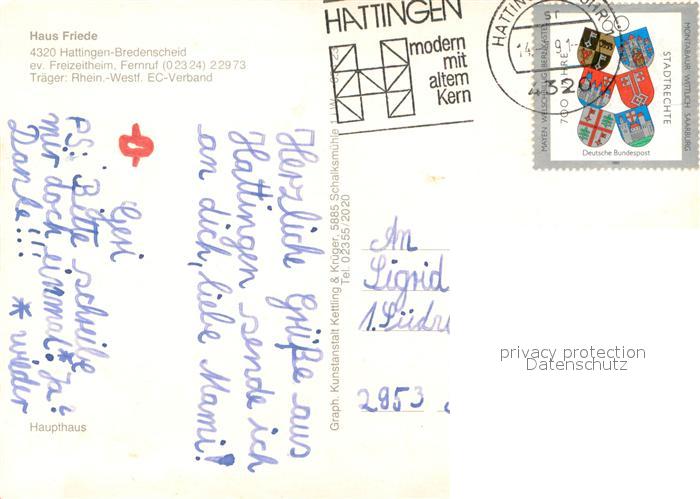 73720360 alte Postkarte Bredenscheid Hattingen Freizeitheim Haus Friede postalisch gelaufen Erhaltung siehe scans [FriedD77] KatCode: 11110005954016