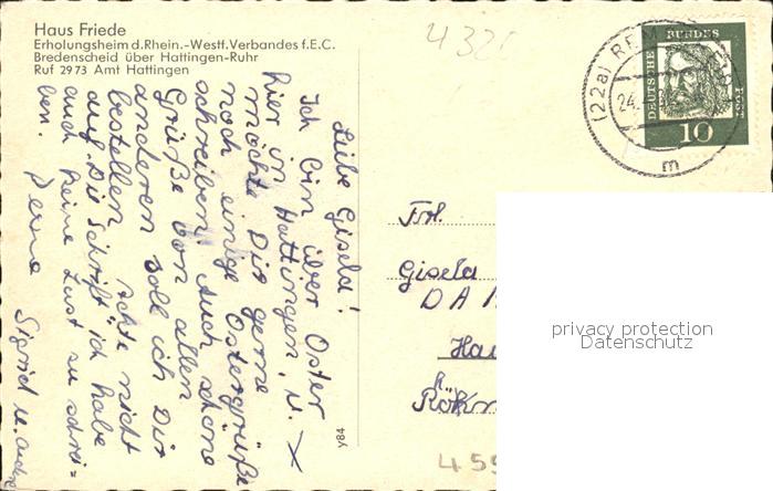 72474771 alte Postkarte Bredenscheid Hattingen Haus Friede postalisch gelaufen Erhaltung siehe scans KatCode: 11110005954016