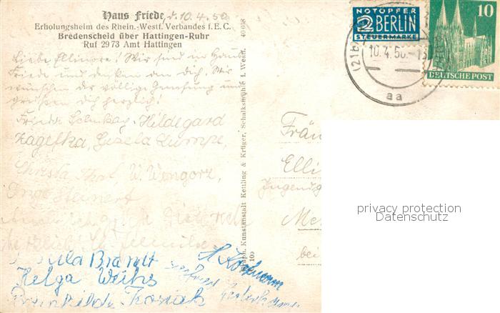 73772587 alte Postkarte Bredenscheid Hattingen Haus Friede Erholungsheim des Rhein.-Westf. Verbandes postalisch gelaufen Erhaltung siehe scans [FriedD77] KatCode: 11110005954016