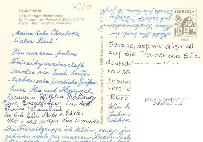 73871105 Bredenscheid Hattingen Haus Friede Haupthaus Freizeitheim Waldhaus Jugendhof postalisch nicht gelaufen Erhaltung siehe scans [WerneD78] KatCode: 11110005954016