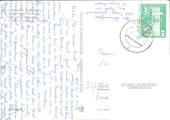 72427750 alte Postkarte Breege Ruegen Juliusruh Dorfstrasse Hafen Strand postalisch gelaufen Erhaltung siehe scans KatCode: 11110013061006