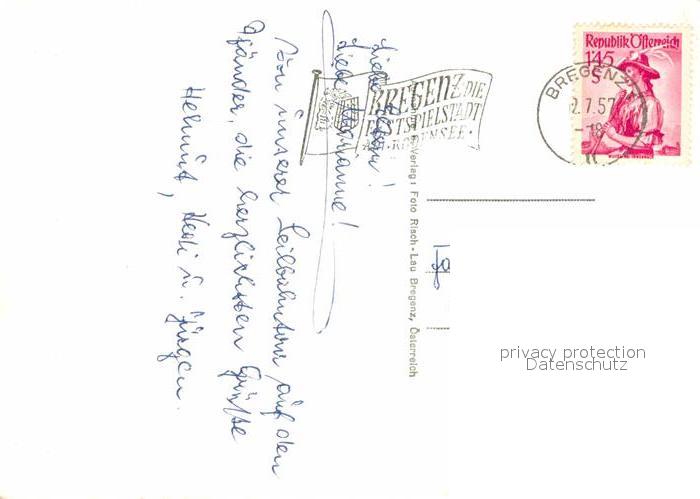 72825169 alte Postkarte Bregenz Bodensee Hafen Faehre Pfaender Bergbahn Kloster Riedenburg Fliegeraufnahme postalisch gelaufen Erhaltung siehe scans [FriedD77] KatCode: 11390342080207