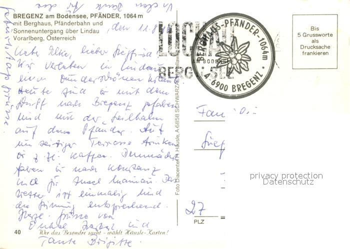 73325225 alte Postkarte Bregenz Vorarlberg Berghaus Pfaender Terrasse Bergbahn Sonnenuntergang Bodensee postalisch gelaufen Erhaltung siehe scans [FriedD77] KatCode: 11390342080207