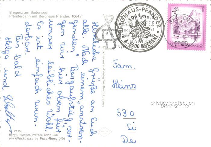 71845358 alte Postkarte Bregenz Vorarlberg Seilbahn Berghaus Pfaender postalisch gelaufen Erhaltung siehe scans KatCode: 11390342080207